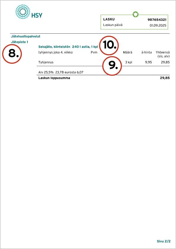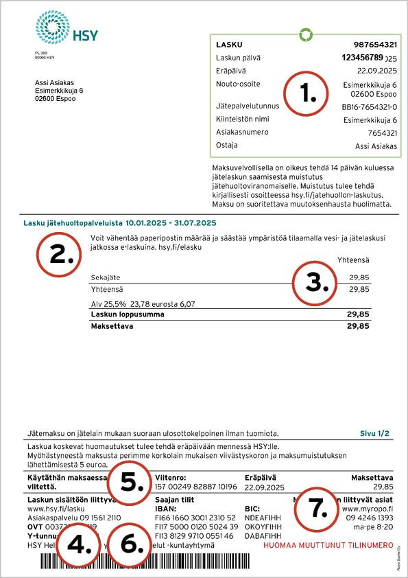 You can learn more about the content of the waste management invoice in the instructions for reading the invoice. As of September 2025, HSY’s invoices will no longer include the traditional bank transfer section. You will continue to find all the information you need to pay an invoice on the invoice itself.