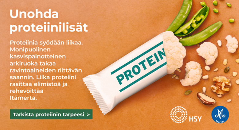 Proteiinia saa tarpeeksi, jos syö lautasmallin mukaisesti. Proteiinipatukoita tai jauheita ei silloin tarvitse. Suomalaiset aikuiset saavat keskimäärin riittävästi määrän proteiinia, useimmat meistä jopa enemmän kuin tarvittavan määrän, kertoo FinRavinto 2017-tutkimus. Suomessa proteiinien puutetta esiintyy lähinnä pitkäaikaissairailla ja huonosti syövillä vanhuksilla.